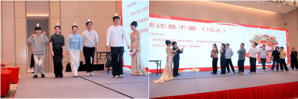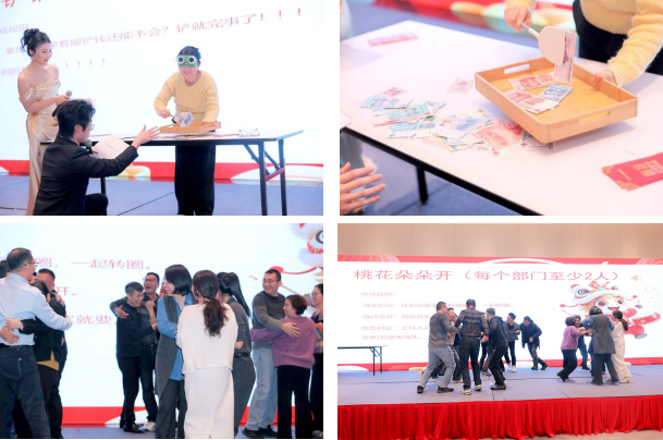 The interactive game segment was particularly engaging, sparking wave after wave of excitement. In the game "Golden Shovel (Blindfolded Money Shoveling)", participants, blindfolded and holding small shovels, struggled to shovel up money scattered all over the area filled with props, with the audience cheering them on non-stop. "Peach Blossoms Blooming (Circle Huddle)" tested everyone's reaction speed and collaboration ability, with laughter and cheers echoing one after another. "Paper Clip and Cup Carrying (Carrying a Cup with A4 Paper)" was particularly challenging, with participants carefully carrying cups with A4 paper, feeling both nervous and excited.