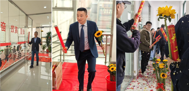 The sound of salutes fell, and everyone orderly entered the lobby of the office building. Each person holds a lucky bamboo/sunflower in their left hand, a ceremonial cannon in their right hand, a symbol of vitality and wealth raised high in their left hand, and joy conveyed tightly in their right hand. They slowly enter the door and say their own auspicious words one by one: